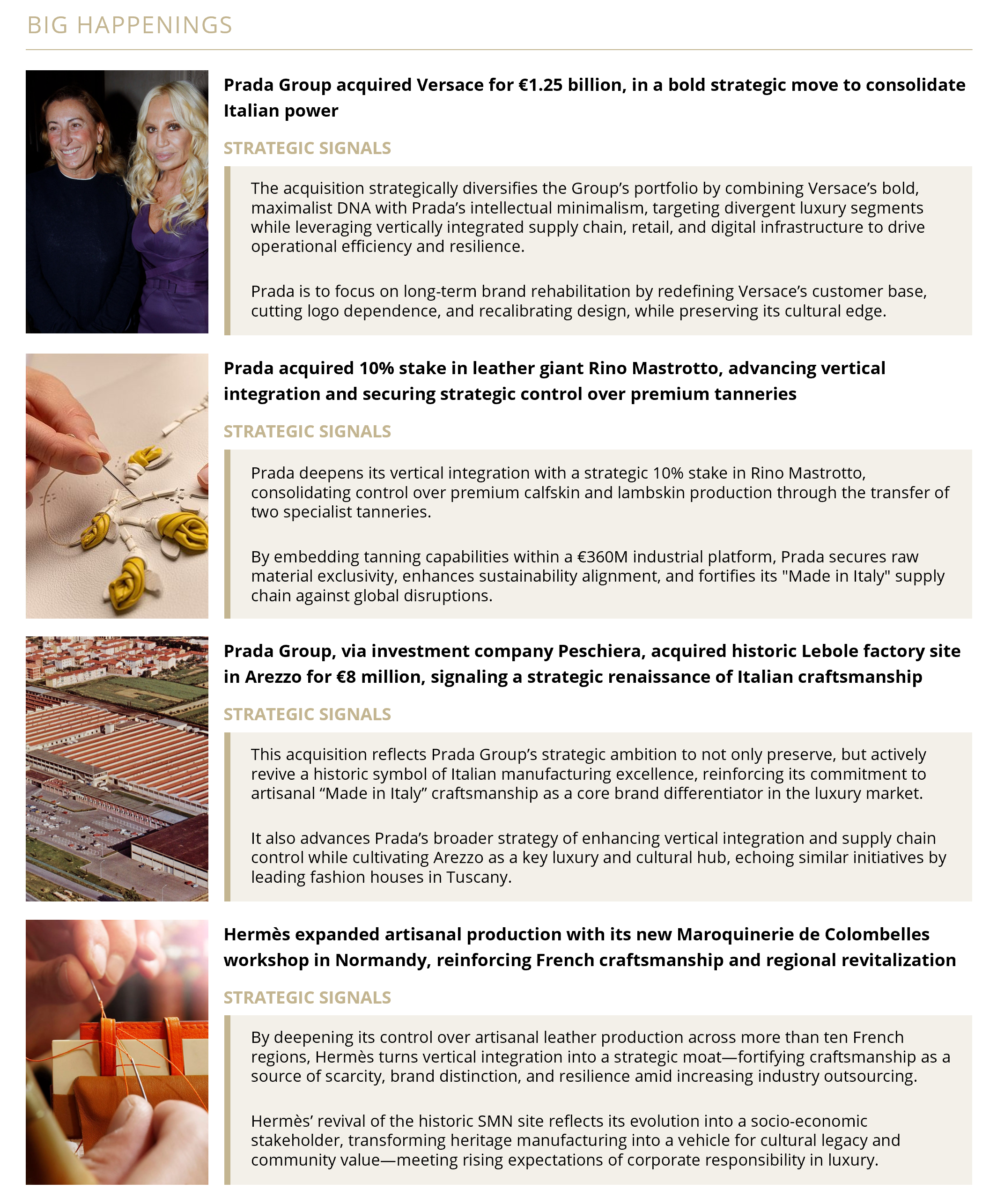Heritage-led maisons such as Hermès and Chanel are set to deepen their investment in craftsmanship as a long-term anchor of brand value. Concurrently, Richemont will continue to elevate its focus on curating and narrating its savoir‑faire to convert artisanal mastery into enduring loyalty. Prada is expected to further amplify its “Made in Italy” identity as a core point of distinction, while groups like Kering stand at a pivotal juncture—tasked with demonstrating whether holistic reinvention can effectively counter market headwinds. LVMH, meanwhile, is to test whether family‑led centralization can leverage dynastic cohesion to sustain performance amid softening demand and external pressures.