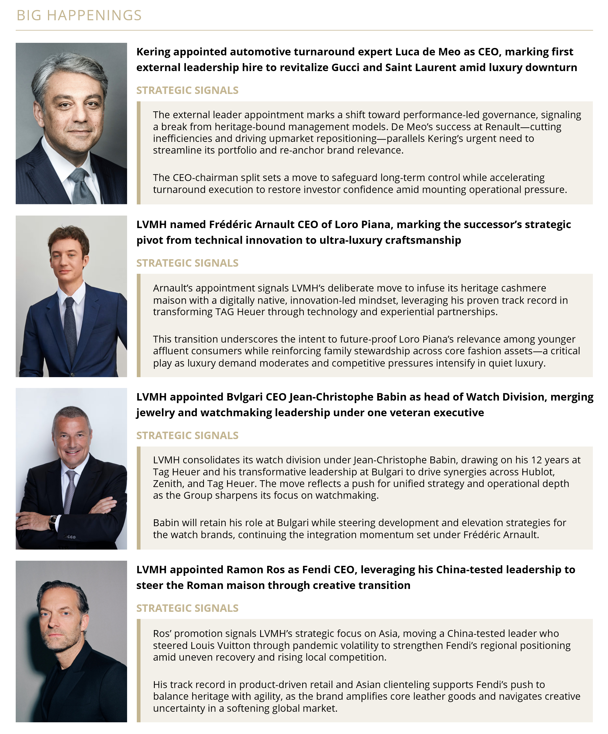 Luxury conglomerates enact strategic executive reshuffles, reflecting intensified focus on governance, operational efficacy, and decisive leadership. By appointing externally sourced and strategically aligned talent, maisons reinforce market responsiveness, operational rigor, and institutional agility. These high-stakes transitions proactively position brands for performance-driven resilience in a dynamically evolving market environment.