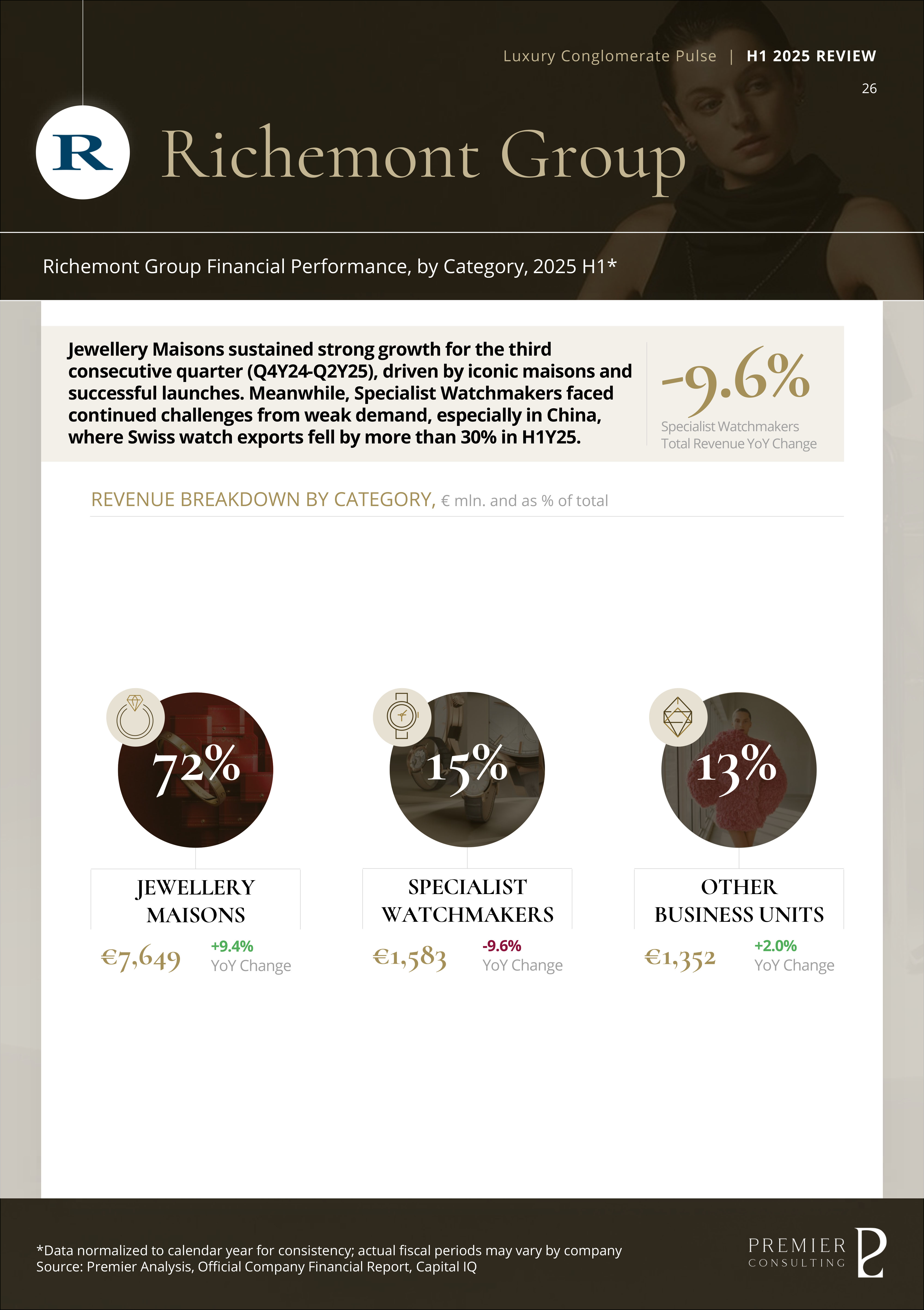 Revenue growth continued under the leadership of the Jewellery Maisons, while the Specialist Watchmakers segment entered a phase of transitional adjustment. Positive momentum persisted in Western markets, with Japan maintaining growth traction, though recovery in Greater China remained sluggish. By focusing on high-net-worth clientele, refining product value architecture, and recalibrating operational rhythms, the Group demonstrated resilience across cycles and a strong command of market dynamics.