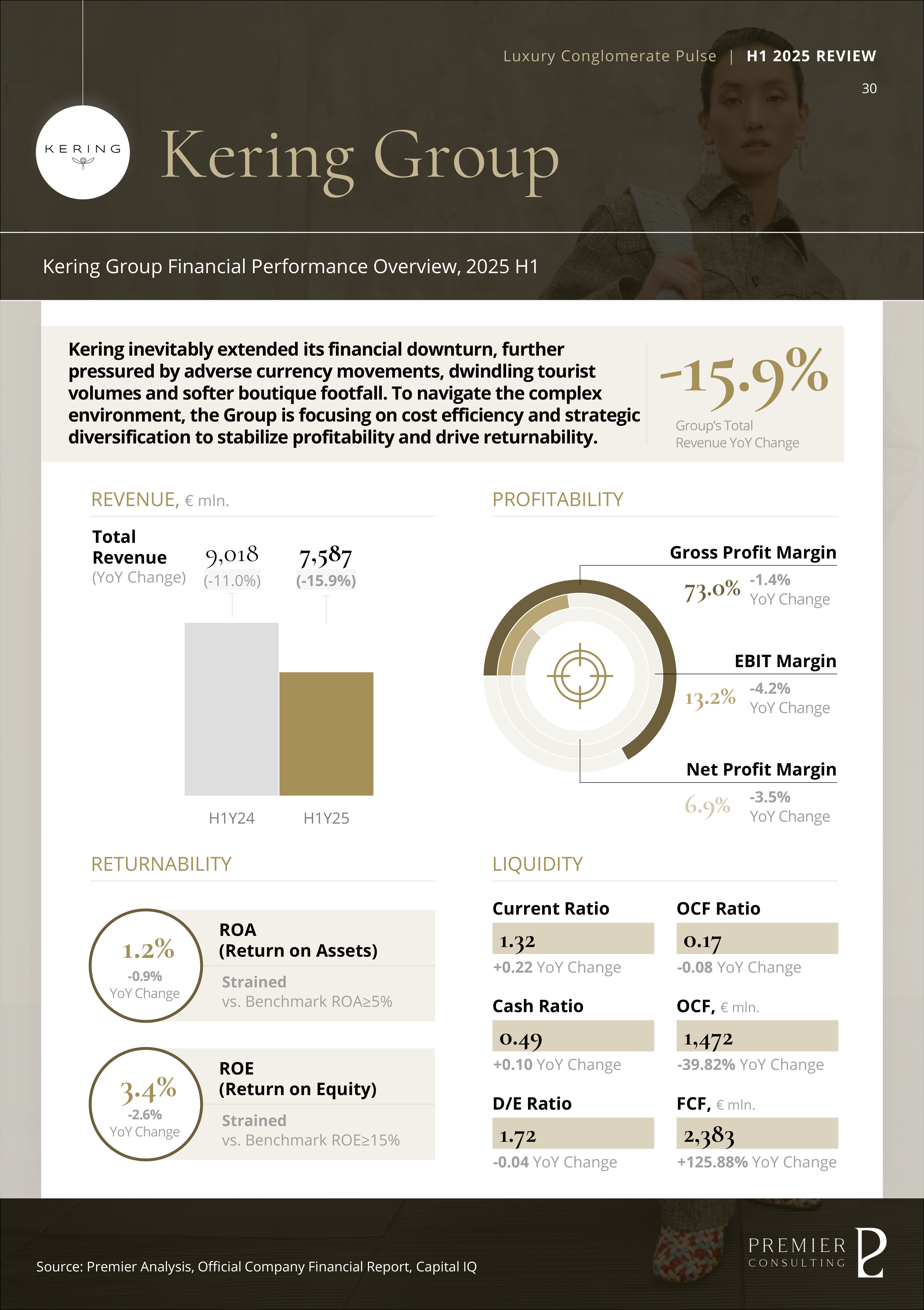 Financial performance remained subdued, as a significant year-on-year sales decline in core brand Gucci weighed heavily on overall revenue. Segments such as beauty and eyewear sustained growth momentum, offering structural support amid broader weakness. Regional trends diverged, with downward pressure particularly pronounced in Asia. The Group accelerated its strategic overhaul, reshaping brand direction through leadership transitions and creative team renewals, while prioritizing cost discipline and channel rationalization to safeguard profitability.